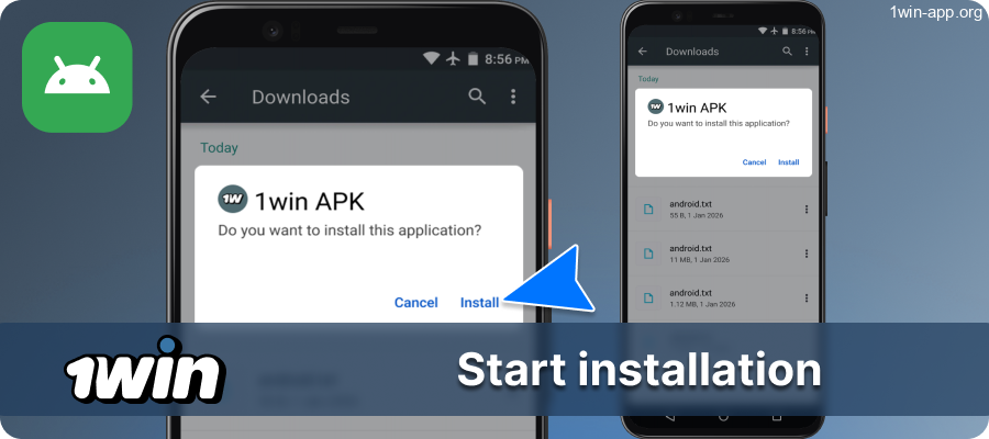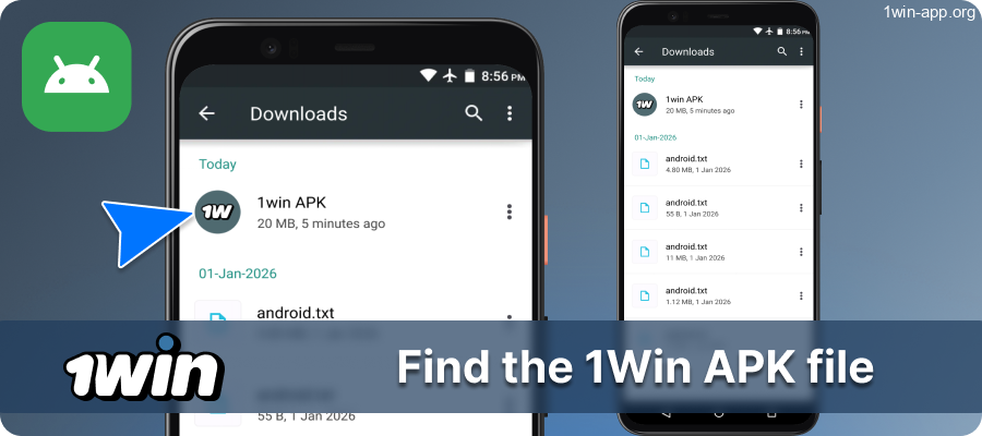 Find the 1Win APK file in your Downloads folder using a file manager.